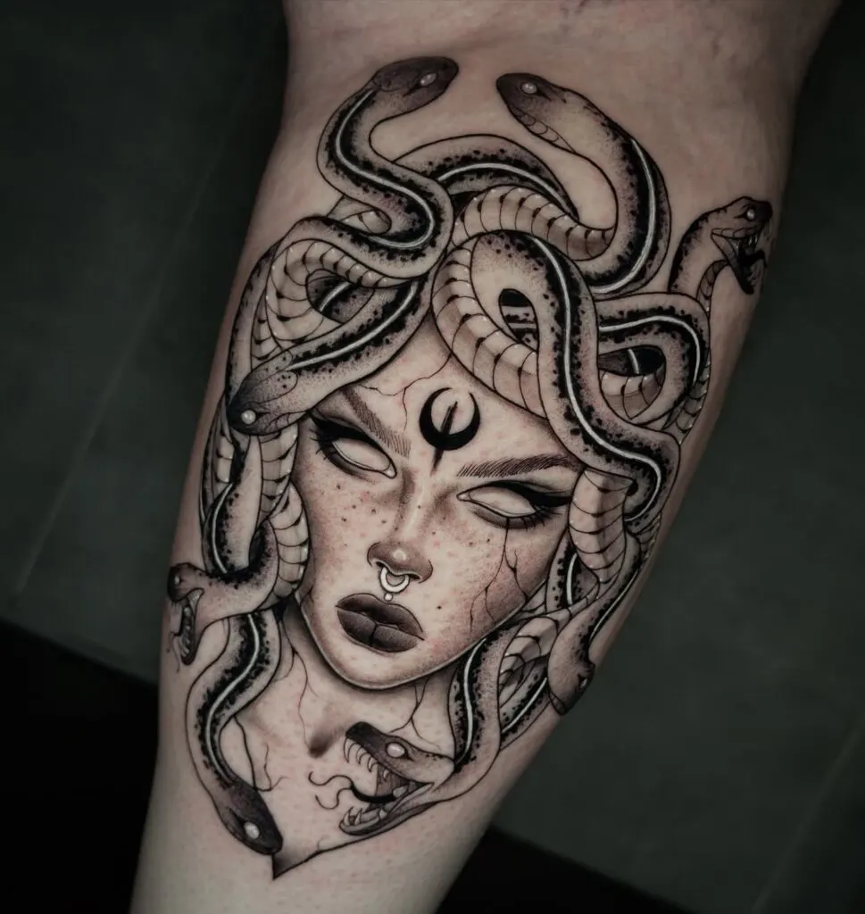 This Medusa tattoo shows a stunningly realistic portrait paired with snakes that rest across her head and neck. The artist used smooth shading and soft highlights to create lifelike features, giving her eyes a confident, almost hypnotic look.