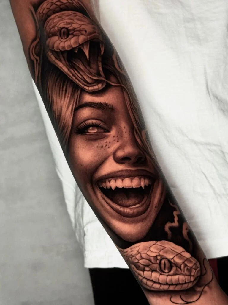 This Medusa tattoo shows a unique twist by pairing a joyful, open-mouthed smile with the classic serpent imagery. Her wide grin and expressive teeth create strong contrast against her blank, mythic eyes. The snakes add intensity, especially the one above her head with its mouth open and fangs exposed.