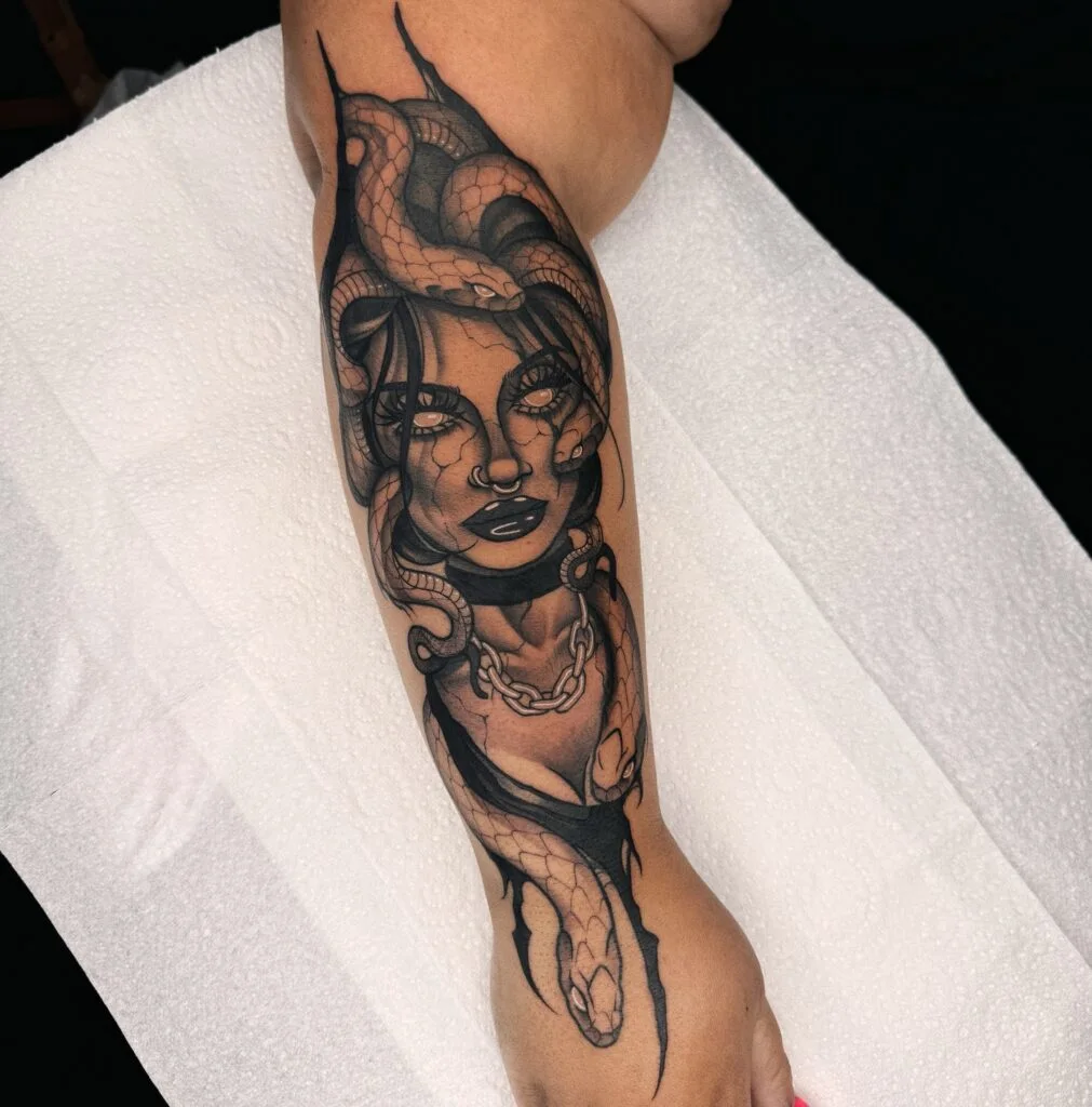 This Medusa tattoo shows a highly realistic portrait paired with a detailed snake wrapped across her forehead. The artist used smooth shading to create lifelike skin texture, including subtle cracks that make her look ancient and powerful.