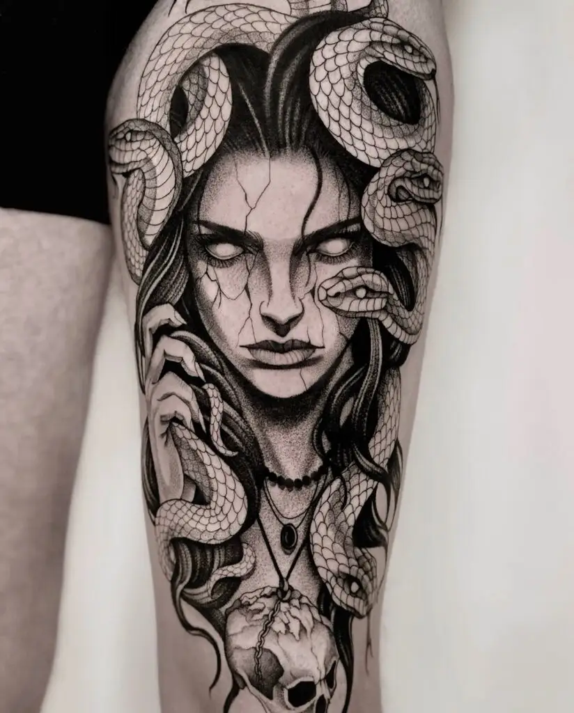 Medusa With Cracked Face, Serpents, and Skull Tattoo