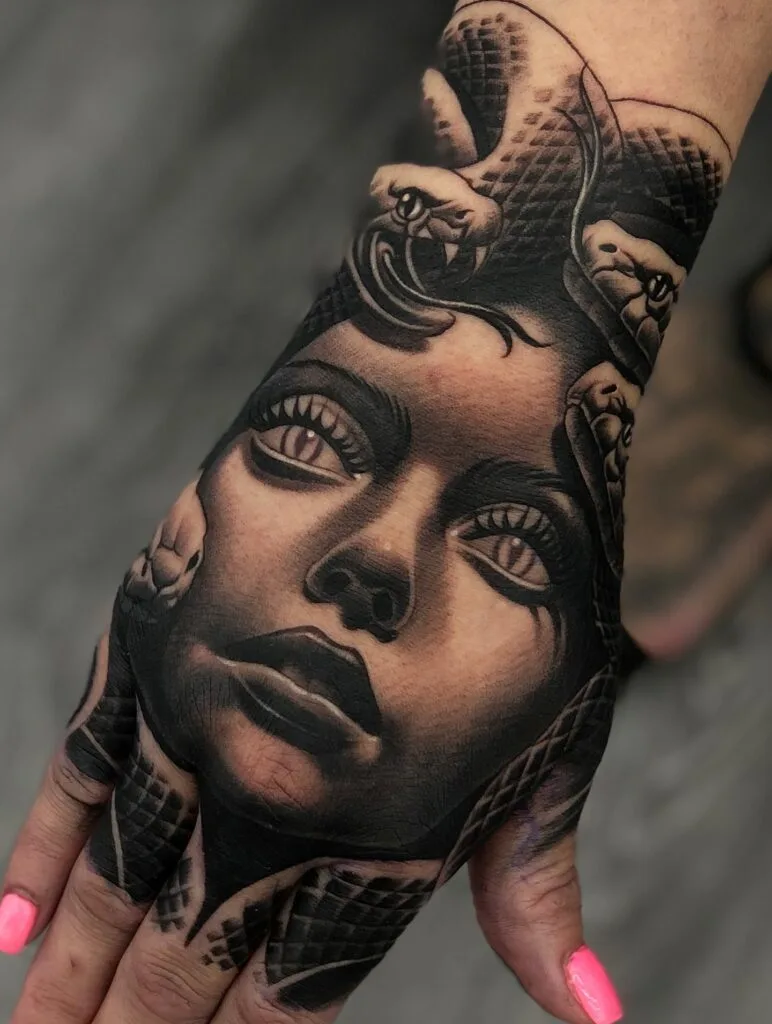 This Medusa tattoo creates a striking effect by covering the entire hand with smooth shading and strong contrast. Her face appears lifelike, with deep shadows shaping her lips, cheeks, and eyes. The snakes curl around her forehead and sides, adding movement and texture without overwhelming the portrait.