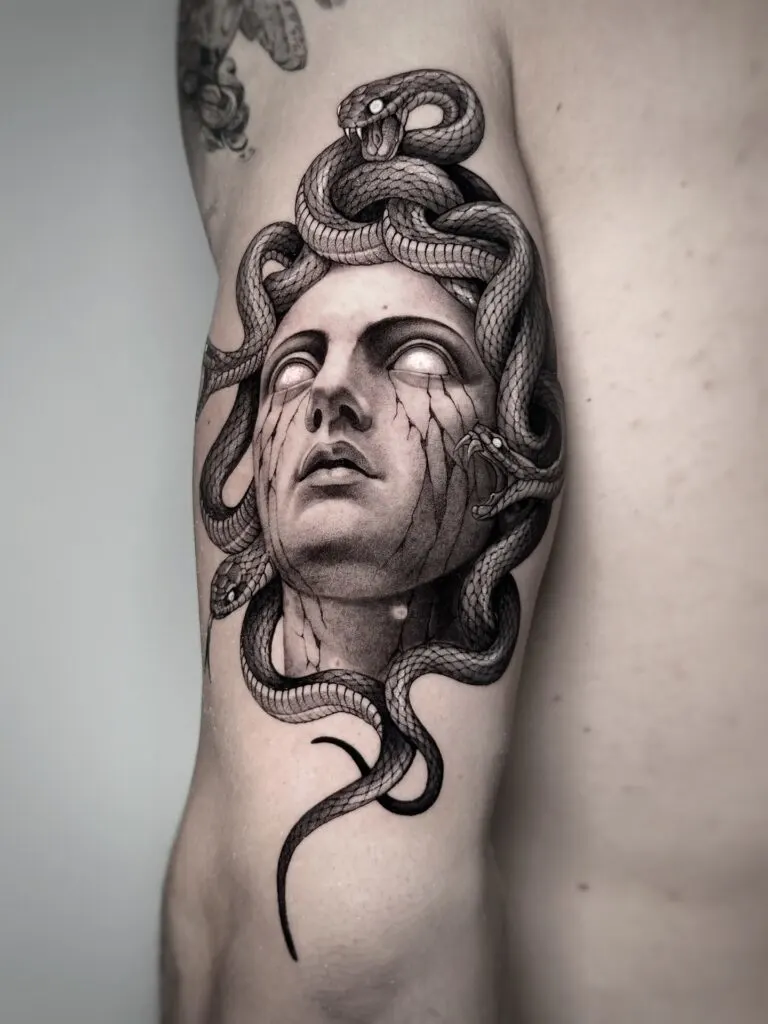 This Medusa tattoo shows a dramatic portrait surrounded by snakes that curl around her hair and neck. Her blank, glowing eyes give her a powerful and haunting presence, while the shading adds depth and strong contrast.