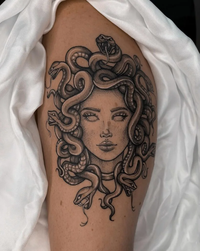 This Medusa tattoo features a full face framed by thick, twisting snakes that wrap around her head and neck. Her blank eyes create a haunting, powerful expression that instantly stands out. The artist used dot-work shading to add depth and texture, giving the snakes a realistic flow as they curl around her.