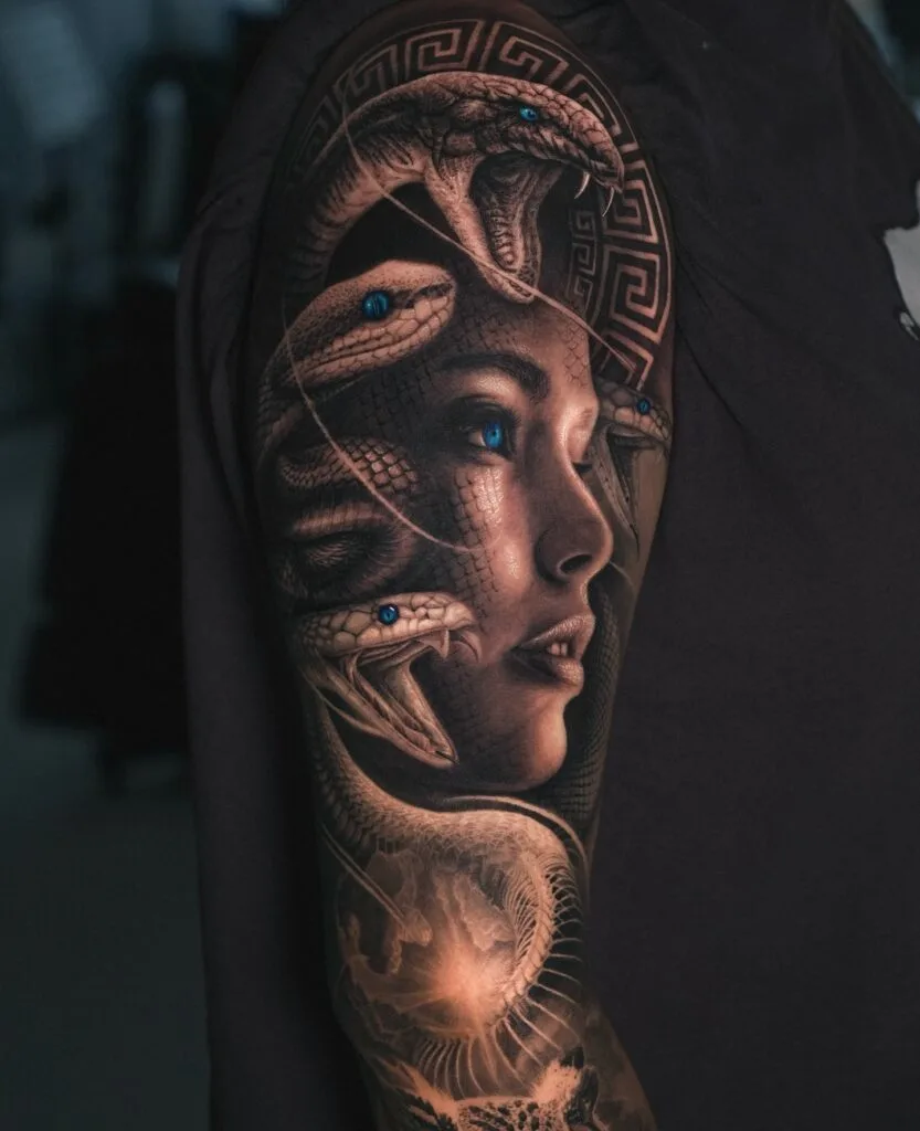 Blue-Eyed Medusa With Serpents and Greek Pattern Tattoo