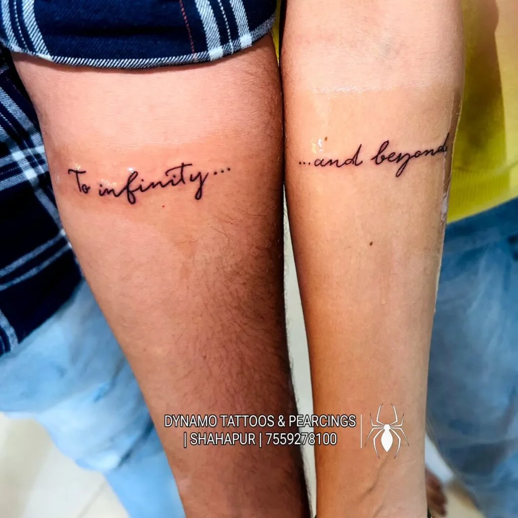 These matching tattoos feature the iconic phrase “To infinity…” on one partner and “…and beyond” on the other, symbolizing limitless love and shared adventures. The elegant script font adds a touch of sophistication to this playful yet deeply meaningful design.