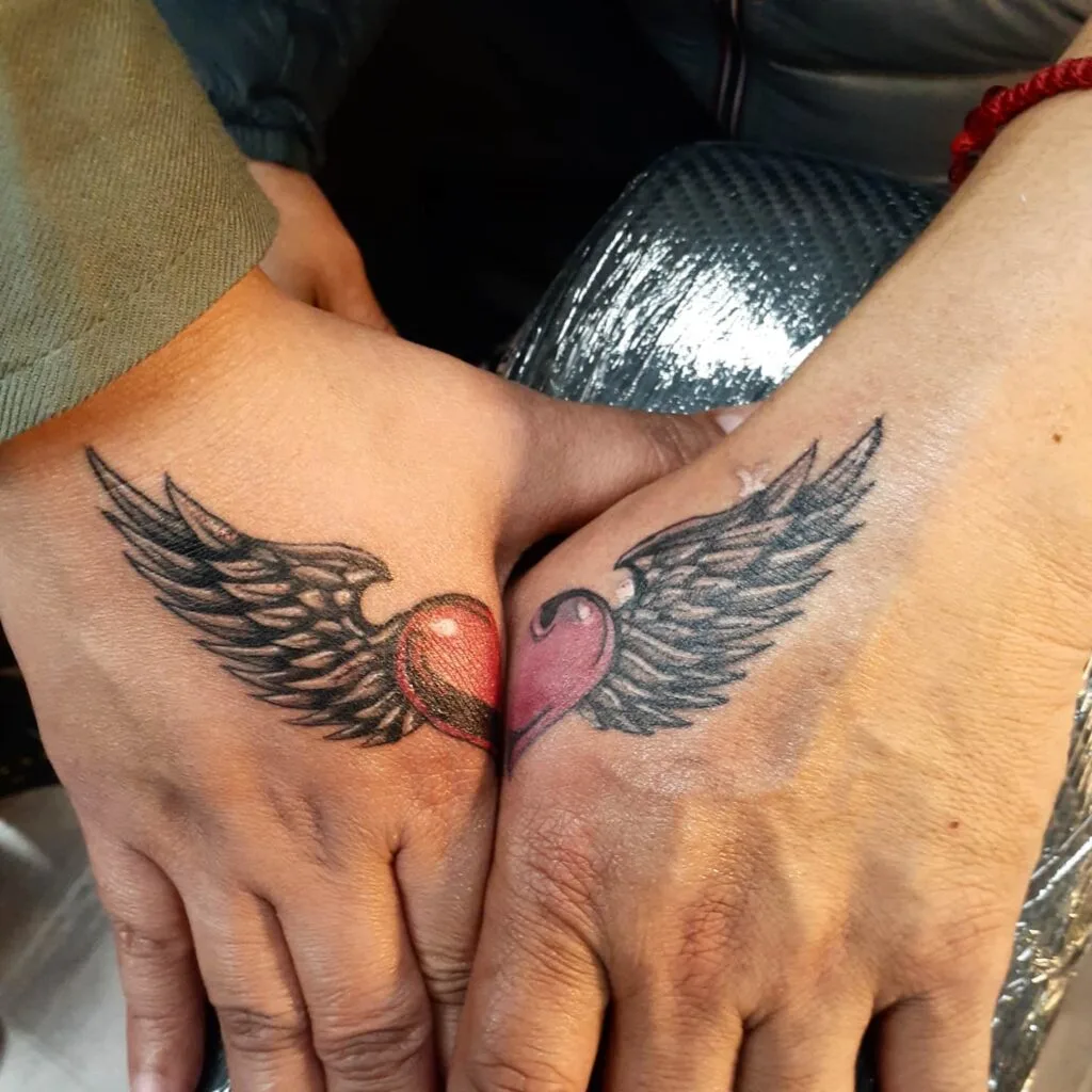 These matching tattoos feature a vibrant red heart split across two hands, each adorned with a detailed wing. When placed together, the heart becomes whole, symbolizing unity, love, and the idea that each partner is the other’s missing piece.