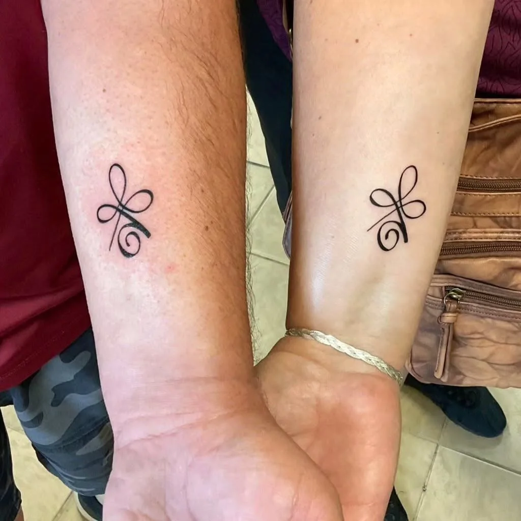 These matching tattoos feature the timeless and meaningful ankh symbol, representing life, eternity, and spiritual connection. Known as the “key of life” in ancient Egyptian culture, the ankh is a powerful emblem of shared vitality and enduring love.
