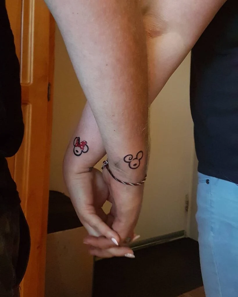 These charming matching tattoos feature minimalist outlines of Mickey and Minnie Mouse, with Minnie adorned with her signature bow. Symbolizing love, fun, and timeless partnership, these tattoos are perfect for Disney-loving couples who cherish a playful and romantic connection.