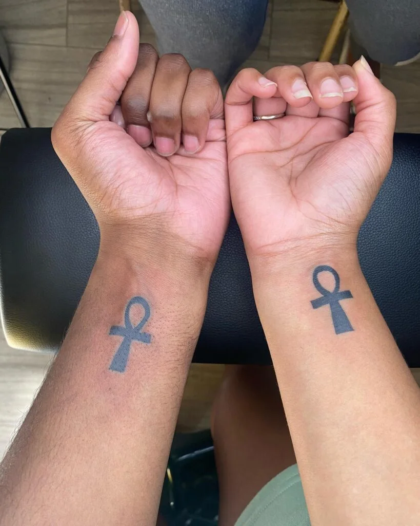 These matching tattoos feature the timeless and meaningful ankh symbol, representing life, eternity, and spiritual connection. Known as the “key of life” in ancient Egyptian culture, the ankh is a powerful emblem of shared vitality and enduring love.