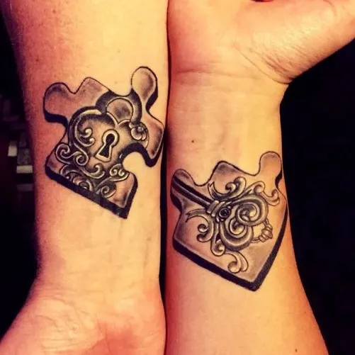 These matching tattoos creatively feature two puzzle pieces, one adorned with a key and the other with a lock, symbolizing a perfect fit and deep connection. The intricate designs of the key and lock emphasize uniqueness and individuality, while the puzzle pieces signify how the partners complete and complement each other.