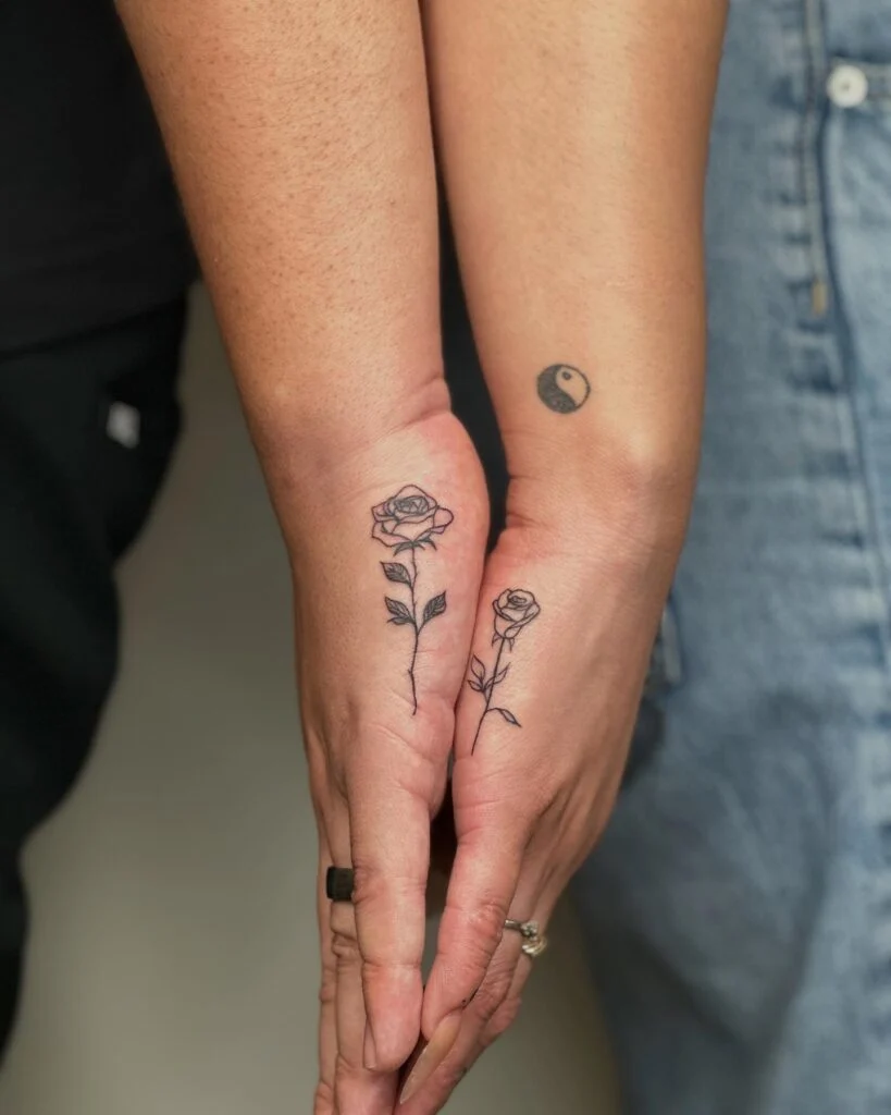 These matching tattoos feature delicate roses with stems, symbolizing love, beauty, and growth within the relationship. Placed on the outer hands, the roses align when the couple’s hands come together, emphasizing their unity and connection. The minimalist design highlights the elegance of the flowers, making this tattoo both timeless and meaningful.