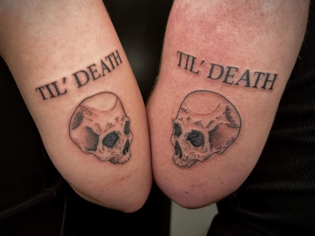 These matching tattoos feature the phrase “Til’ Death” paired with intricately detailed skulls, symbolizing eternal love and commitment even beyond life. The bold lettering combined with the skull design conveys a powerful message of devotion, emphasizing the enduring strength of the bond between the couple.