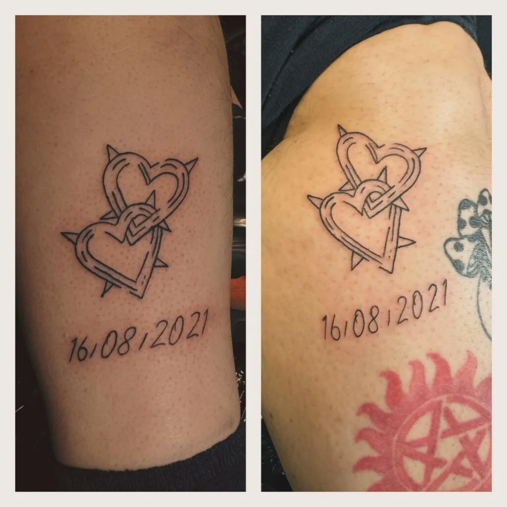 These matching tattoos feature two interlinked hearts adorned with bold outlines and edgy details, symbolizing a deep, unbreakable connection. Below the hearts, the date “16/08/2021” is prominently displayed, marking a significant milestone in the couple’s journey. The design blends simplicity with meaningful personalization, celebrating love, commitment, and shared memories.