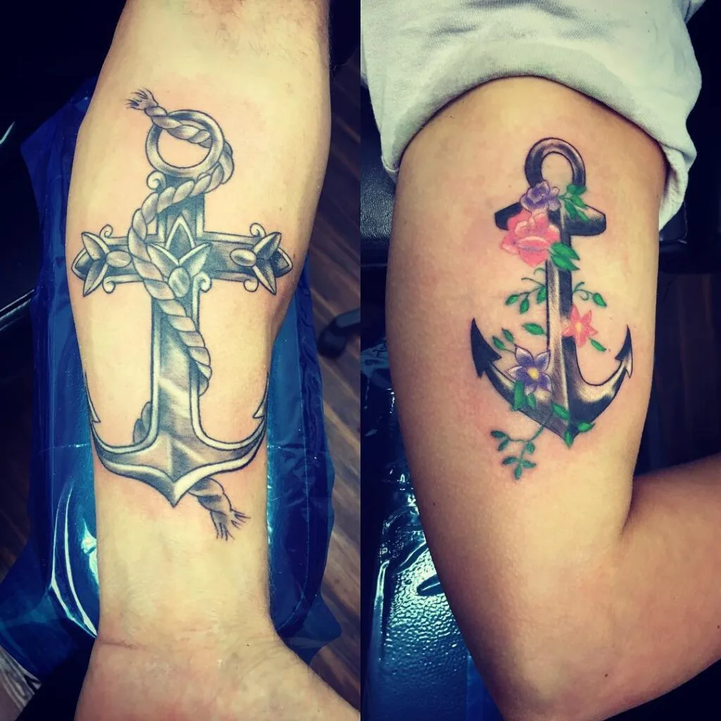 These matching anchor tattoos feature distinct yet complementary designs. One tattoo showcases a bold, shaded anchor with a rope tied around it, symbolizing strength, stability, and resilience. The other depicts a softer, colorful anchor adorned with delicate flowers and leaves, representing beauty, growth, and harmony. Together, these tattoos embody the balance of grounding and nurturing qualities in a relationship.