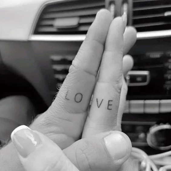 These minimalist matching tattoos spell out the word “LOVE” when the couple’s fingers come together, symbolizing unity and affection. Each partner has two letters inked on their fingers, representing how they complete each other and their bond.