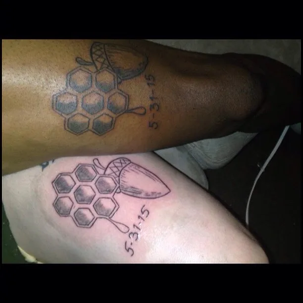These matching tattoos combine the symbolism of an acorn and a honeycomb, representing growth, strength, and the sweetness of shared life. The addition of the date “5-31-15” personalizes the design, marking a significant milestone in the couple’s journey. The acorn symbolizes potential and perseverance, while the honeycomb reflects unity, cooperation, and nurturing love.