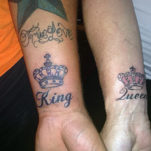 Placed prominently on the wrists, these tattoos celebrate the couple’s roles as equals in their partnership, reigning together with strength and unity. A perfect choice for couples who view their relationship as a kingdom built on love, loyalty, and admiration.