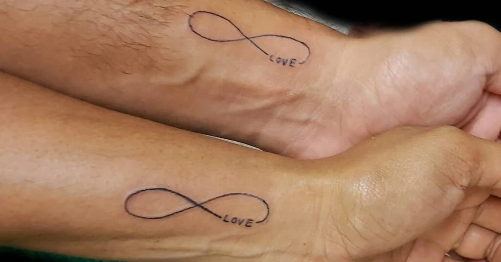 These matching tattoos elegantly combine the infinity symbol with the word “love,” creating a timeless representation of eternal affection and commitment. Placed on each partner’s wrist, the simple design reflects the unending bond they share. The clean lines and minimalistic style make this tattoo a versatile and understated way to showcase a deep connection.
