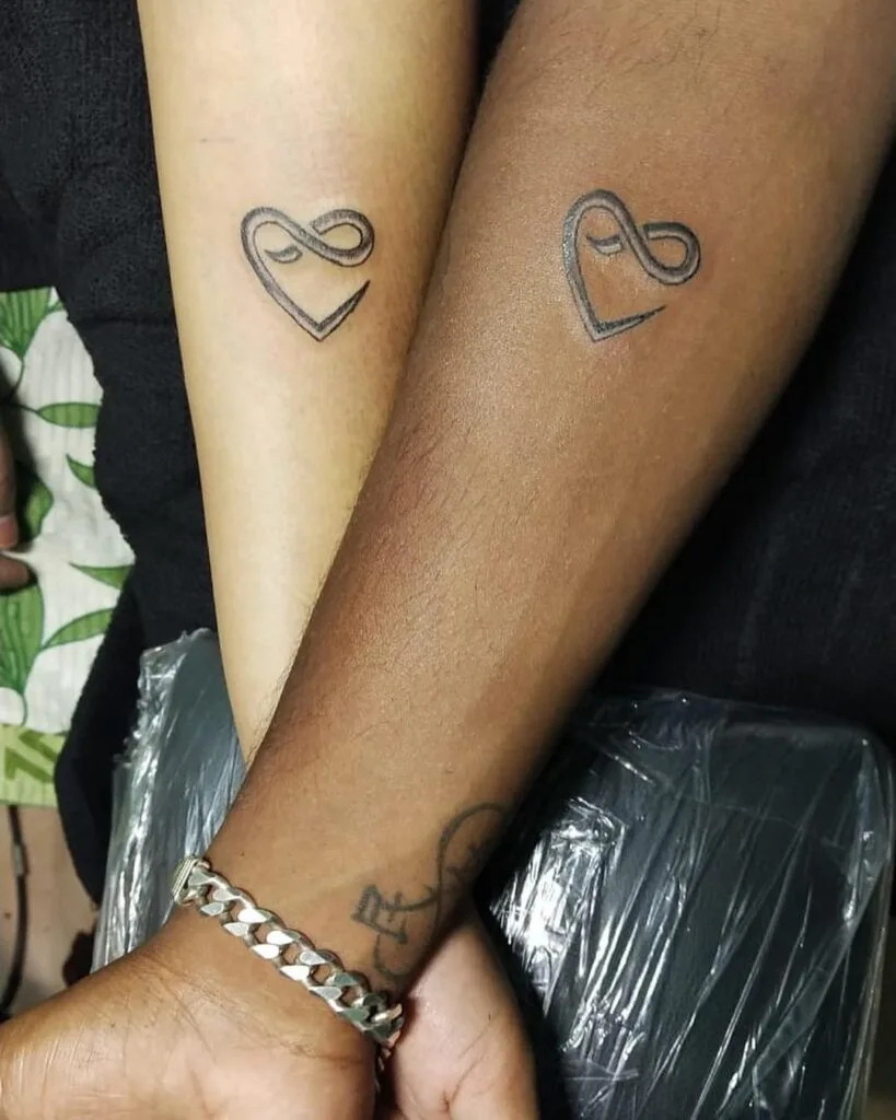 These matching tattoos feature a heart seamlessly integrated with an infinity symbol, representing eternal love and an unbreakable connection. The design’s simplicity and elegance highlight the balance between love and infinity, making it a timeless expression of commitment.