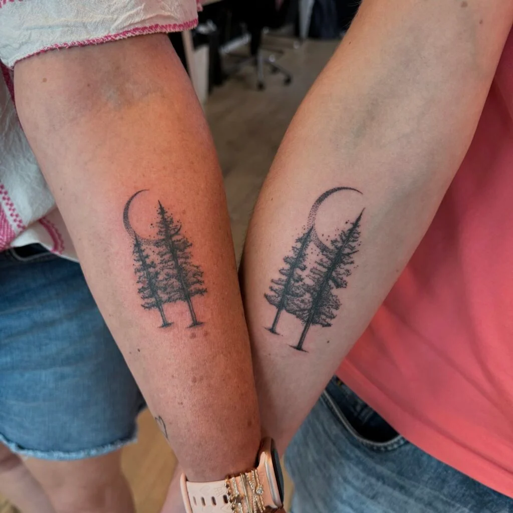 These matching tattoos beautifully capture the serene beauty of a moonlit forest. The design features two tall pine trees under a crescent moon, symbolizing the deep connection to nature and the peaceful, grounding influence it has on both mother and son.