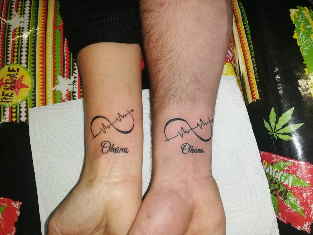 These matching tattoos feature a powerful combination of the infinity symbol intertwined with a heartbeat line and the word “Ohana,” which means family in Hawaiian. The design represents the endless love and unbreakable bond shared between mother and son.