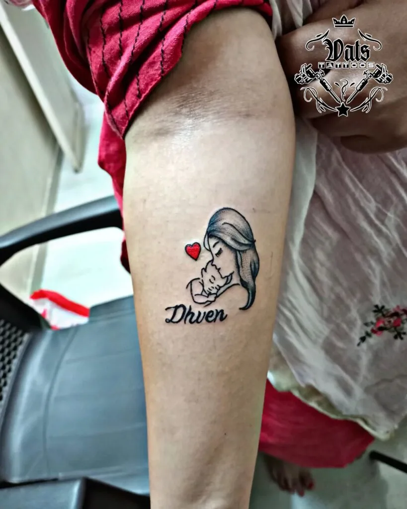 The addition of the name makes it personal and meaningful, highlighting the importance of the child’s presence in the mother’s life. This tattoo serves as a permanent reminder of the unconditional love and connection that exists between mother and child, forever cherished.