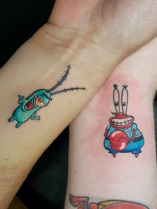 These playful matching tattoos feature the characters Plankton and Mr. Krabs from the beloved animated series “SpongeBob SquarePants.” The mother’s tattoo shows Mr. Krabs, the money-loving, yet caring character, while the son’s tattoo depicts the mischievous and determined Plankton.