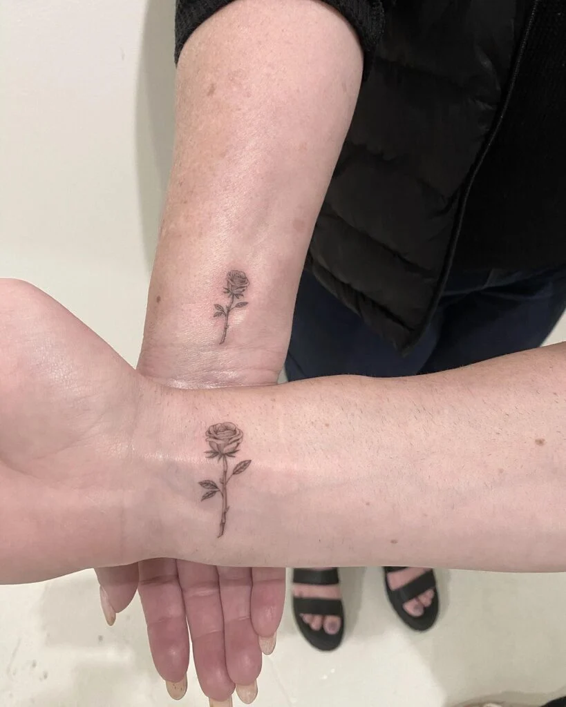 These matching rose tattoos, elegantly placed on the mother’s and son’s wrists, symbolize love, beauty, and the enduring nature of their relationship. The fine line work and minimalistic design reflect a sense of simplicity and grace, making it a perfect choice for those who appreciate subtle yet meaningful expressions of their bond.