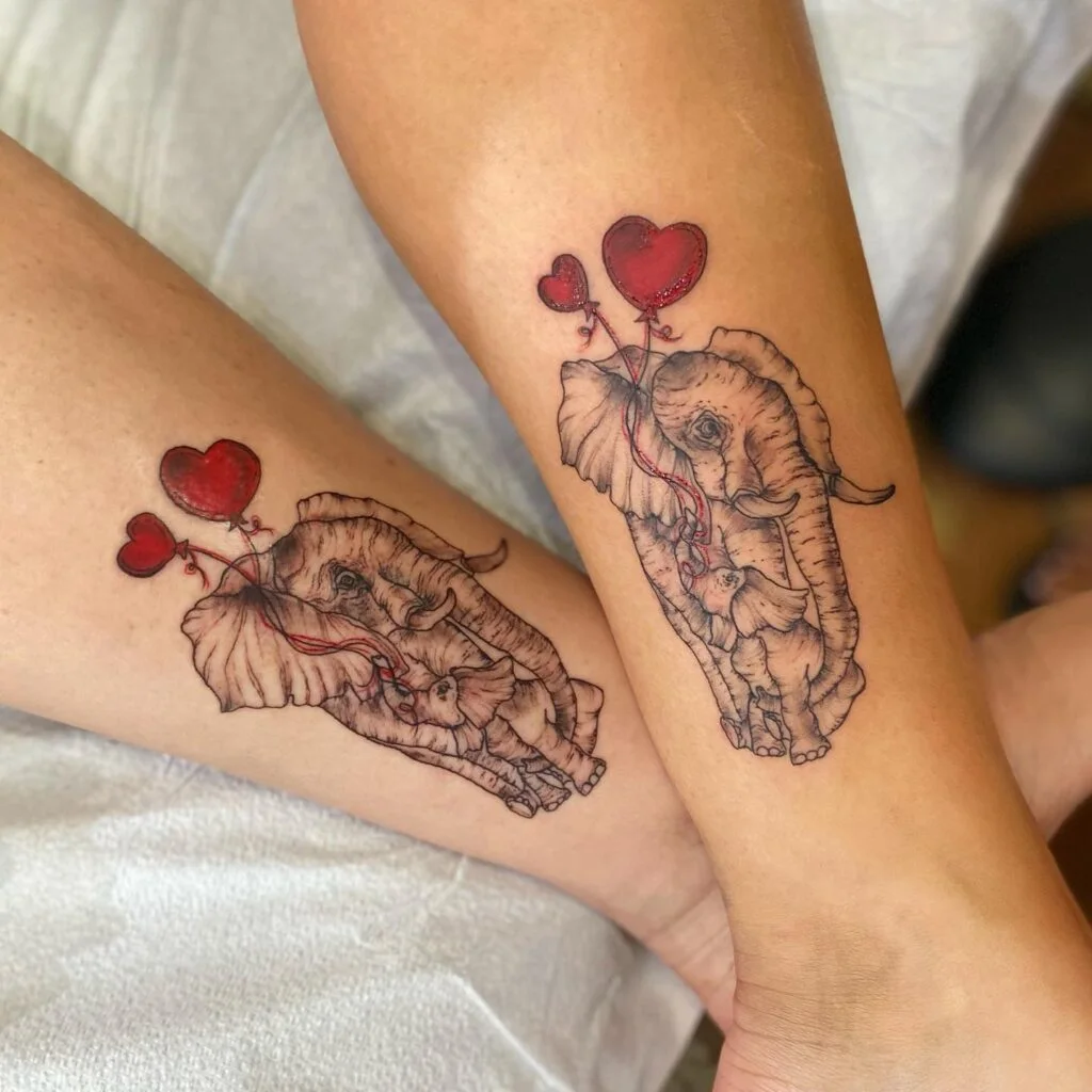 These matching tattoos feature a beautifully detailed illustration of an adult elephant and its calf, symbolizing strength, wisdom, and the deep bond between mother and child. The addition of two vibrant red heart balloons adds a playful and loving touch to the design, representing the unbreakable connection and the love shared between the wearers.