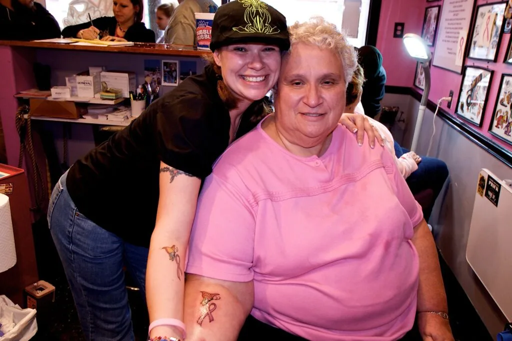 The tattoos serve as a meaningful tribute to the shared journey of mother and daughter, celebrating their courage and unity in the face of adversity. Placed on the arm, these tattoos are a constant reminder of their strength and the importance of raising awareness.