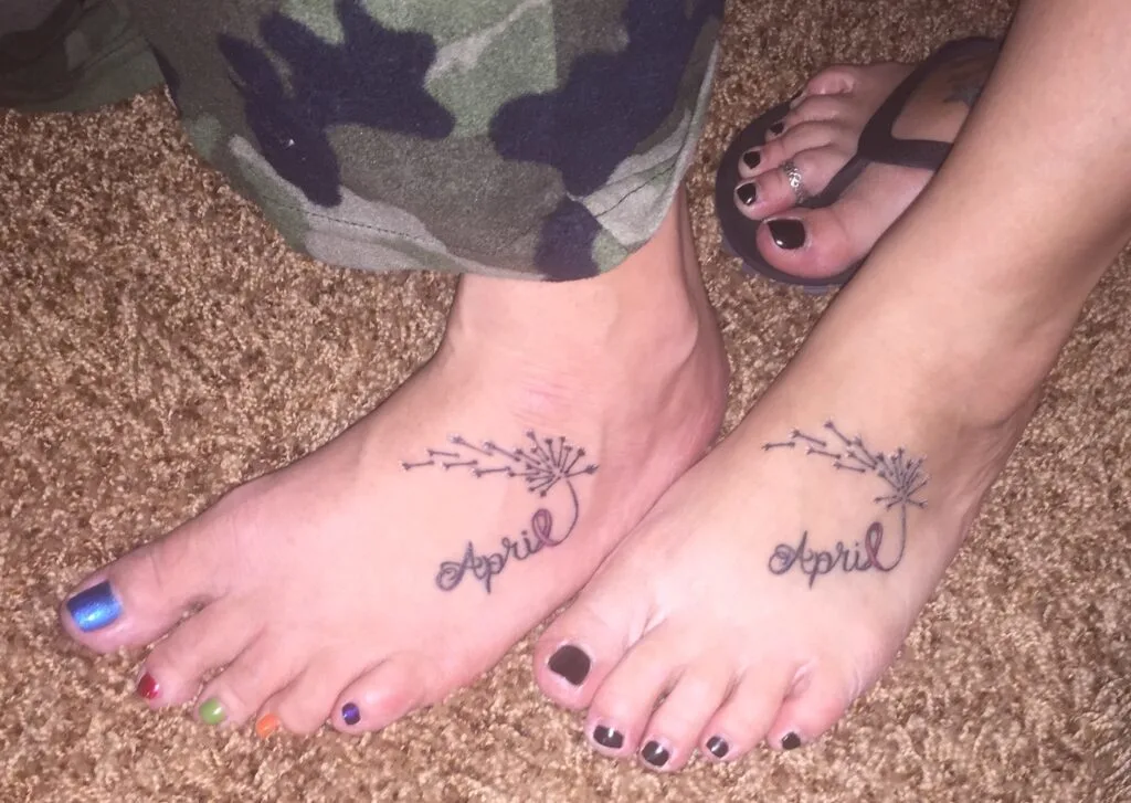 These matching foot tattoos feature a delicate dandelion design paired with the name “April,” symbolizing wishes, dreams, and the beauty of new beginnings. The dandelion’s seeds appear to be blowing in the wind, representing the fleeting nature of time and the importance of cherishing moments shared between mother and daughter.