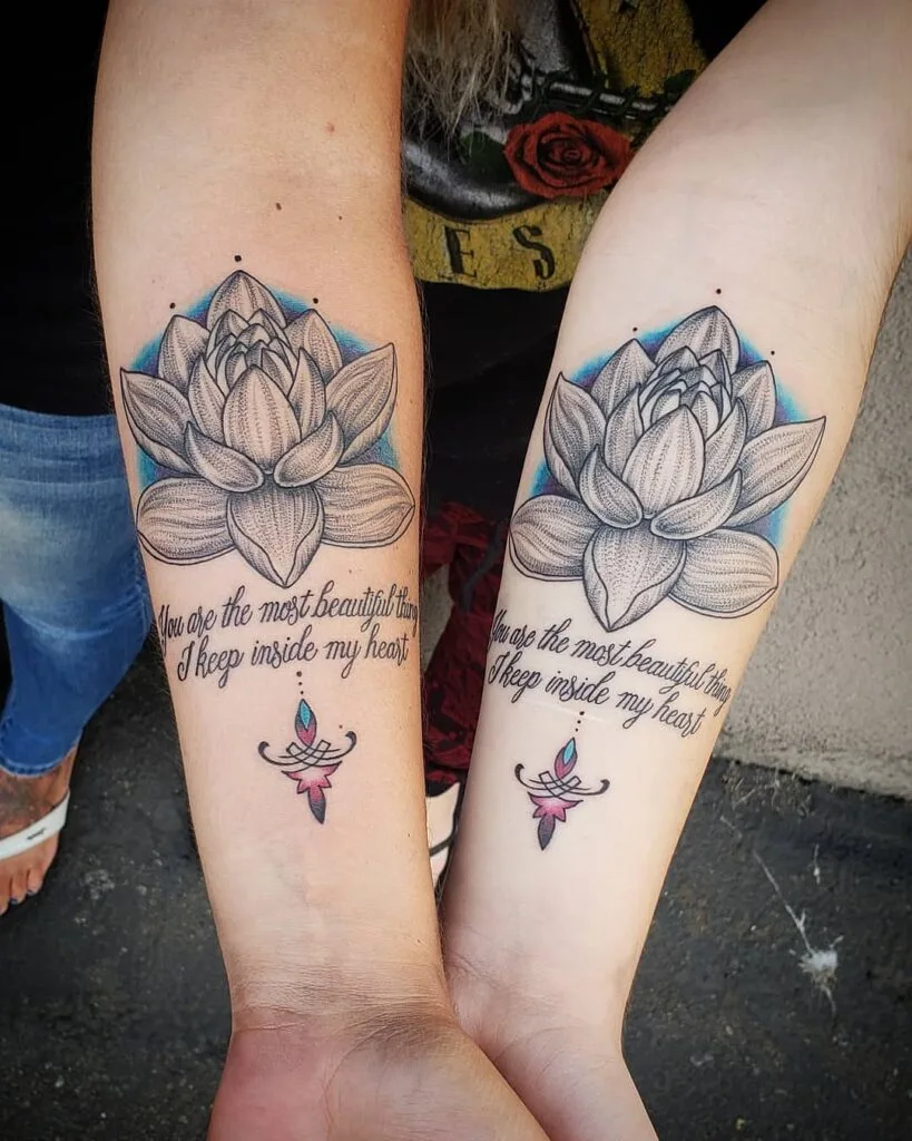 The soft blue shading behind the lotus adds depth and a calming effect to the design, while the small ornamental element below the quote enhances the overall aesthetic. These tattoos serve as a constant reminder of the precious and irreplaceable bond they share, symbolizing the beauty they hold in each other’s hearts.