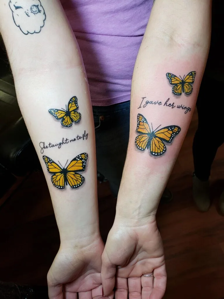 These vibrant tattoos feature monarch butterflies, symbolizing transformation, growth, and the powerful bond between a mother and daughter. The designs include the heartfelt phrases, “She taught me to fly” and “I gave her wings,” reflecting the nurturing relationship and mutual support that empowers both to soar.