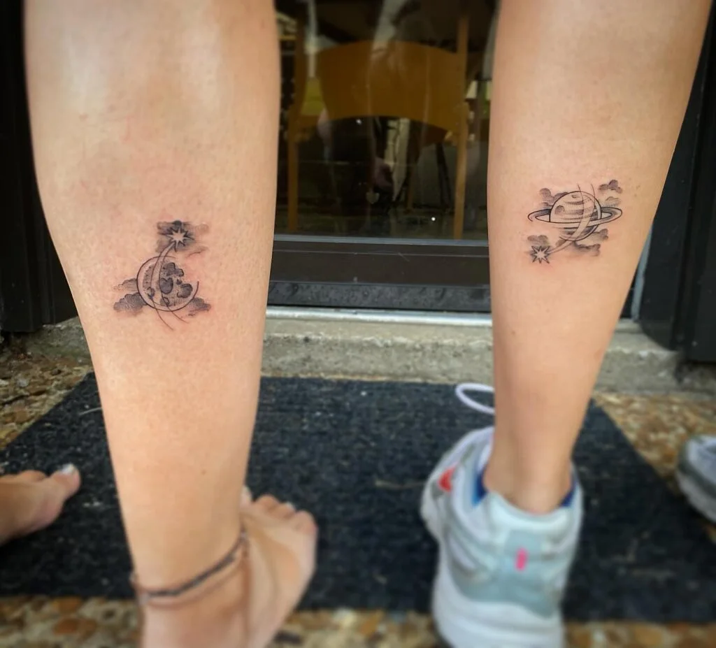 These matching mother-daughter tattoos feature celestial designs—one with a crescent moon and a star, and the other with the planet Saturn surrounded by a ring. The subtle cloud details add depth, evoking a sense of wonder and connection to the universe.