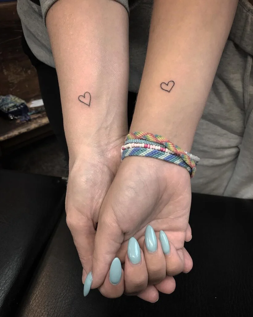 These matching tattoos feature a small, minimalist heart design on the forearm, symbolizing the pure and unconditional love shared between mother and daughter. The simplicity of the heart shape makes this tattoo timeless and meaningful, capturing the essence of their bond in a subtle yet powerful way.
