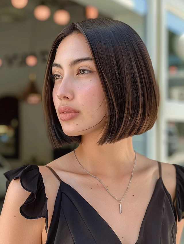 This haircut rests at the shoulders with clean edges and minimal layering. It works best for oval and heart-shaped faces, maintaining balance and proportion. Fine hair appears healthy and full with proper shaping.