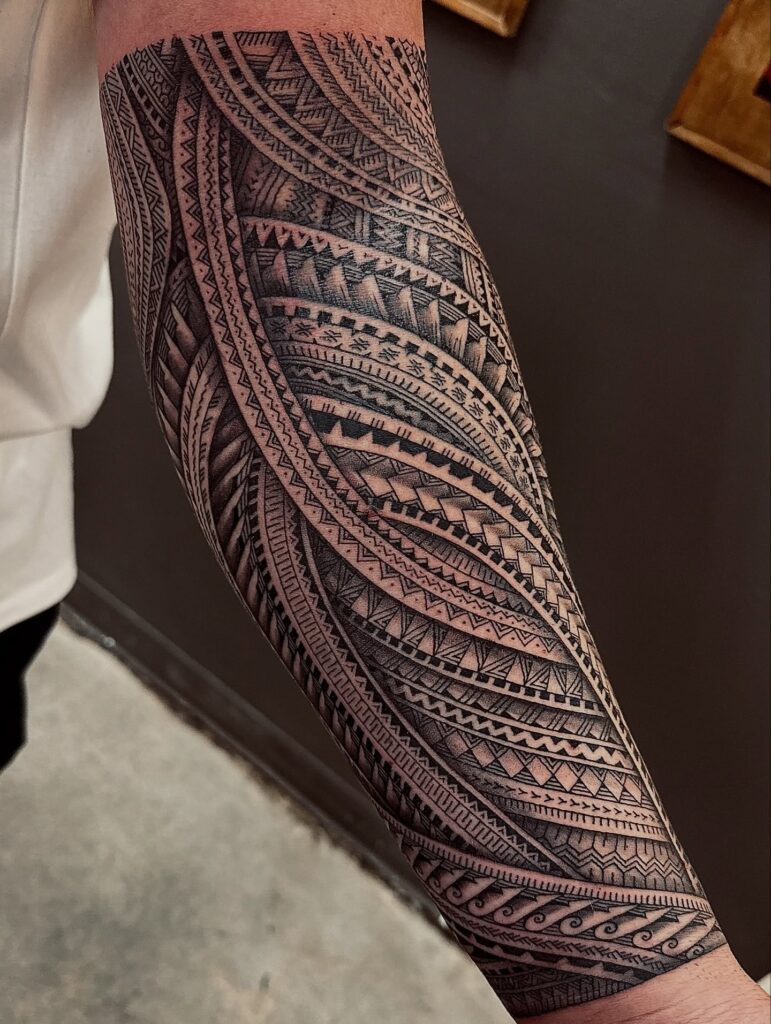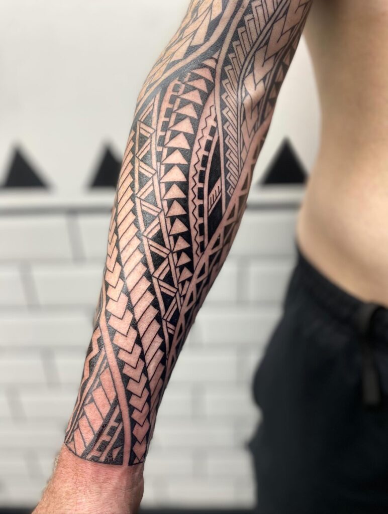 Thick black areas ground the piece and highlight the lighter patterns around them. This structure gives the tattoo a clear sense of rhythm and movement, making it a striking choice for anyone wanting a detailed Polynesian forearm design.