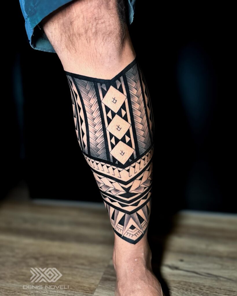 Triangular motifs add a sharp look that contrasts well with wider geometric bands. The layout covers the leg evenly, so the design feels balanced from every angle. This approach creates a powerful statement that highlights movement, heritage, and personal strength.