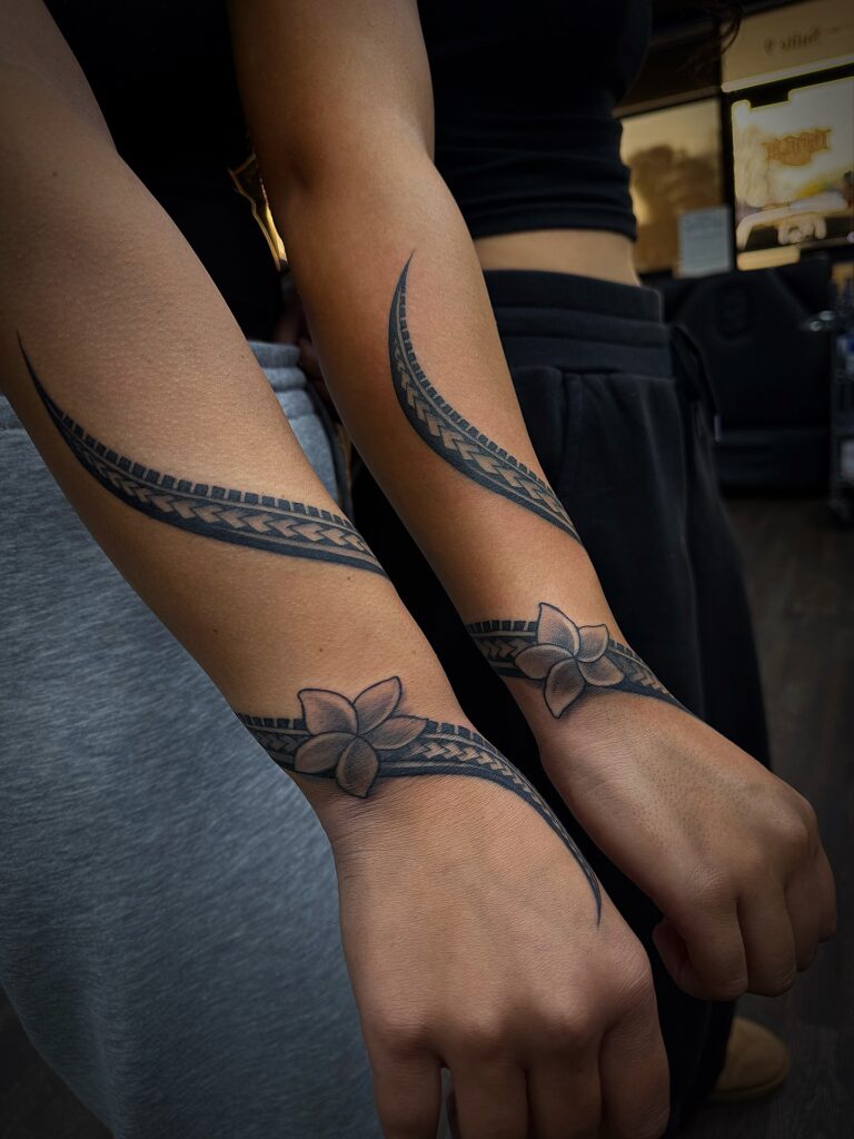 These matching Polynesian wrist tattoos use flowing lines to create a smooth shape that curves naturally around the forearm. Each tattoo features a plumeria flower placed near the wrist, adding a soft touch that contrasts with the sharper geometric patterns running through the band.