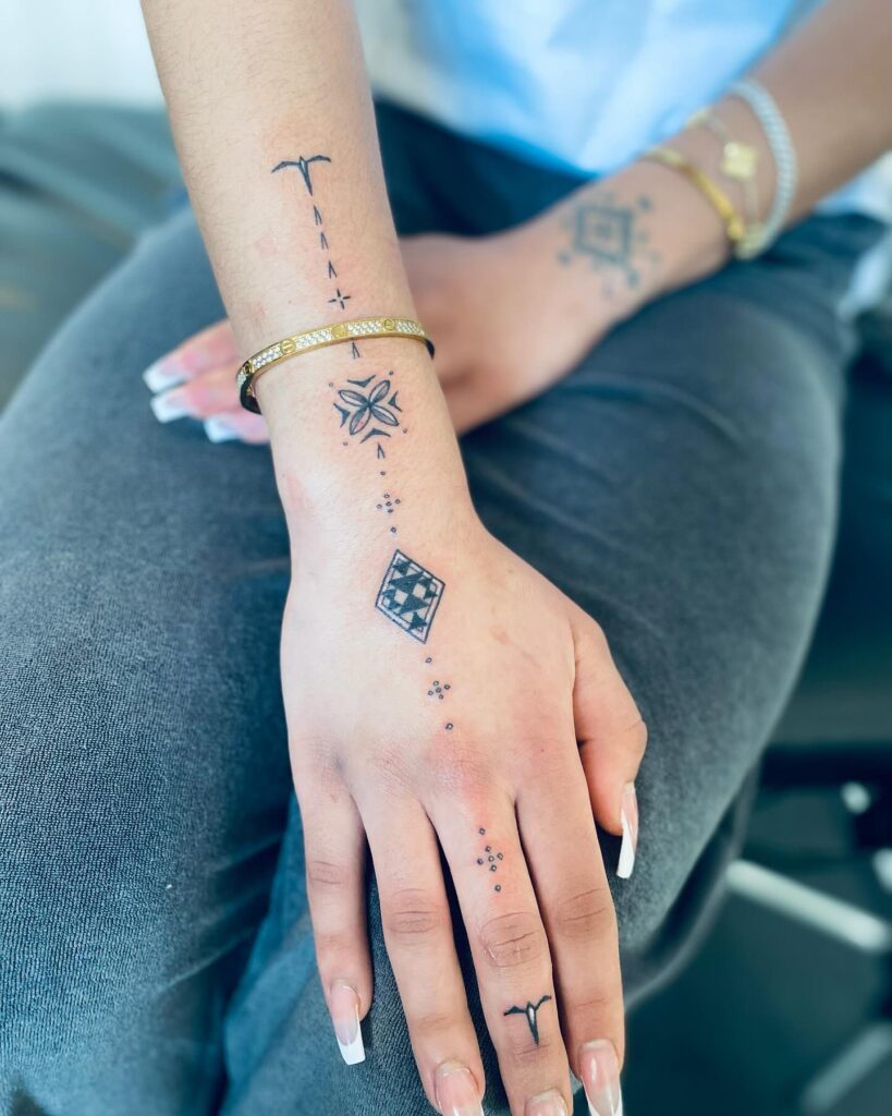 This minimal Polynesian hand tattoo uses small, clean symbols arranged in a vertical line that runs from the wrist to the fingers. A simple bird-like mark sits near the wrist, guiding the eye downward to a delicate flower-inspired motif on the hand.