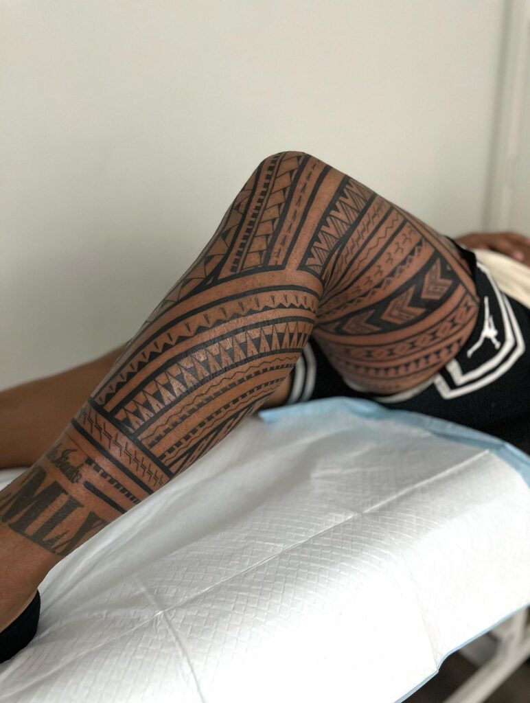 This full leg Polynesian tattoo uses bold blackwork patterns to create a strong, unified design that flows naturally from the hip to the ankle. The lines move in sweeping curves that guide the eye across repeated shapes, giving the piece clear rhythm and structure.