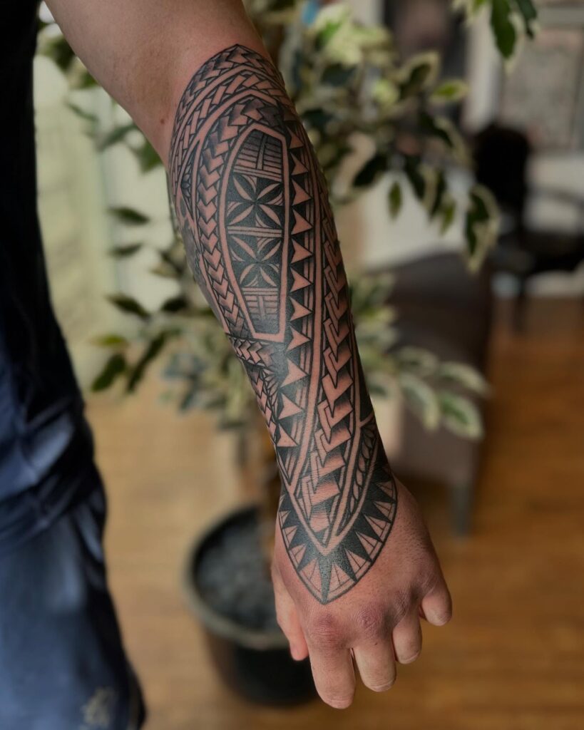 This Polynesian forearm tattoo features sharp angular patterns that move diagonally across the arm, creating a bold sense of direction. Triangular motifs stack neatly to form strong borders, while woven textures and curved lines soften the layout and keep the design balanced.