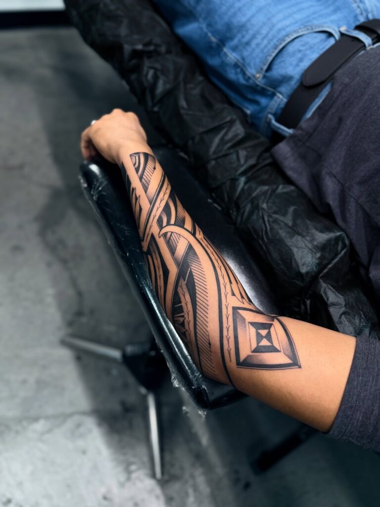 Polynesian Forearm Tattoo with Angular Geometric Flow