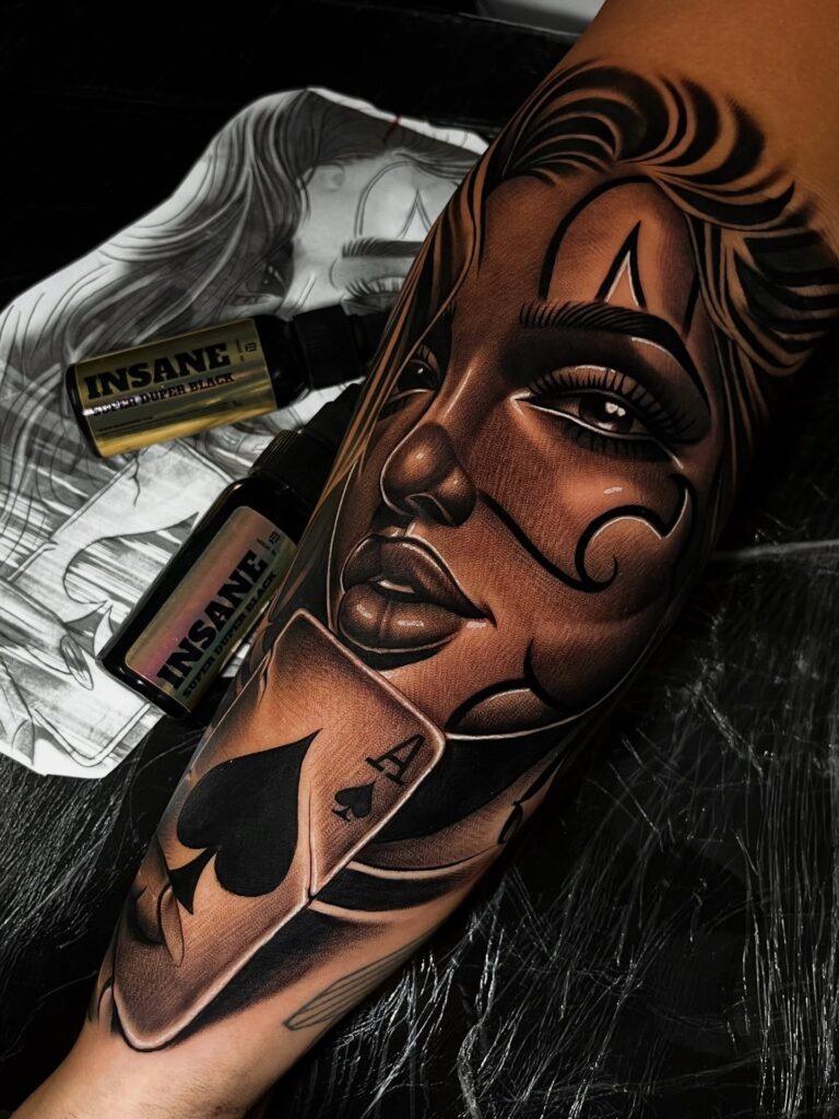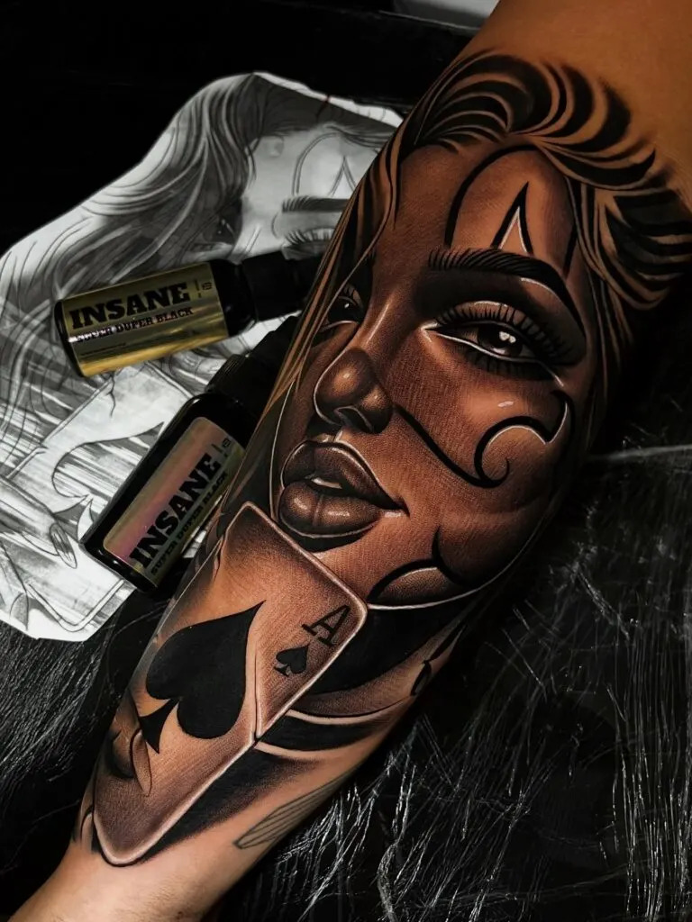 Thick black tones add depth, while lighter highlights create a polished finish. The Ace card sits across her lower face and gives the piece a symbolic edge, suggesting power, luck, and confidence. The overall look feels intense and grounded, creating a striking tattoo with a clear Chicano influence.