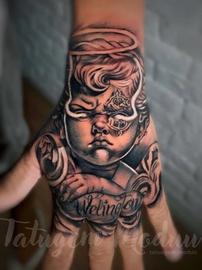 This tattoo features a striking Chicano-style baby angel placed across the hand, giving the piece strong visual impact. The design uses deep shading to highlight the child’s expressive face, creating a powerful mix of innocence and toughness.
