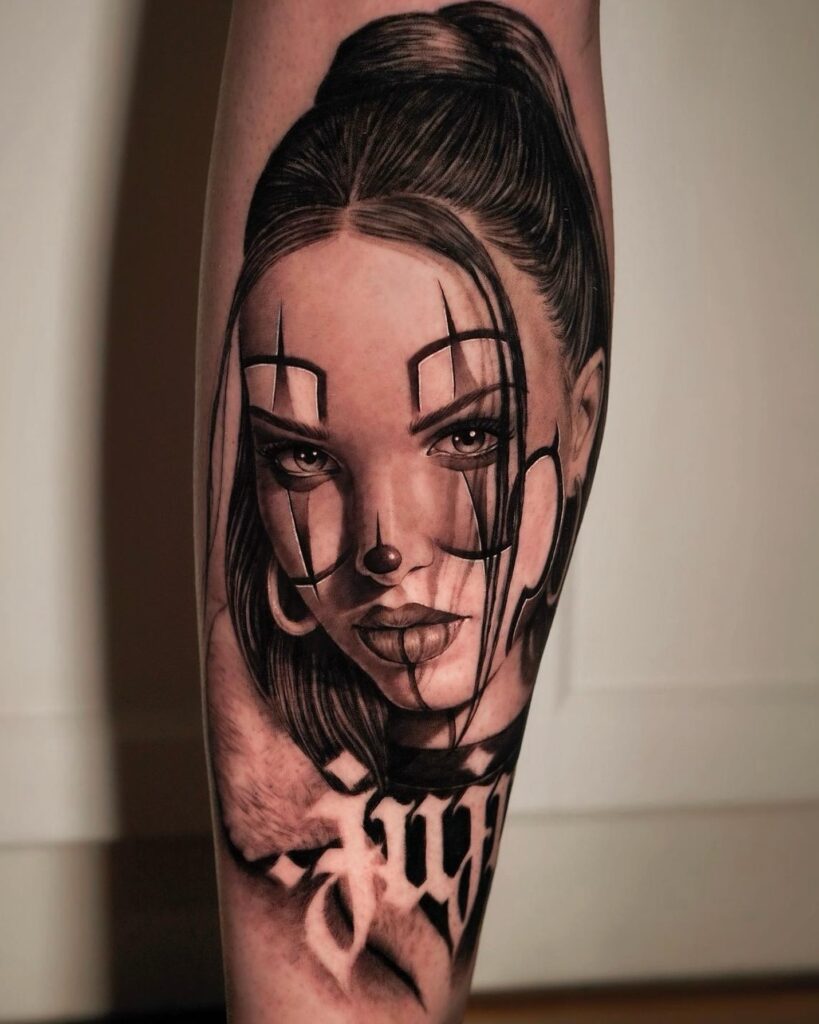 This tattoo features a detailed Chicano-style woman wearing a patterned bandana and bold clown-inspired facial markings. Smooth shading shapes her eyes, lips, and nose, giving the portrait a realistic and expressive look.