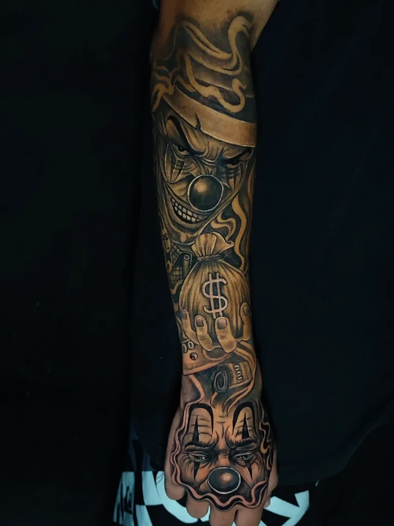 The hand continues into a second clown face on the knuckles, creating a smooth transition across the arm. Strong contrast, bold outlines, and rich shading give the entire piece a powerful and intimidating presence.