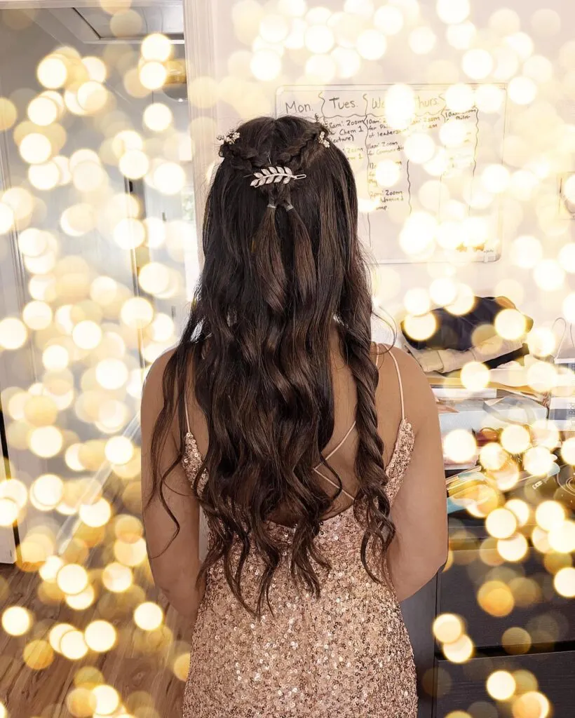 Its structured top contrasts beautifully with the loose, wavy ends, giving the hairstyle a polished yet youthful feel. This look stands out perfectly for prom while keeping a modern, photo-ready finish.