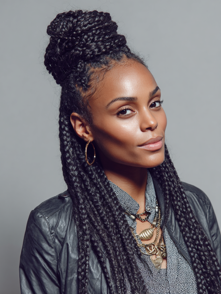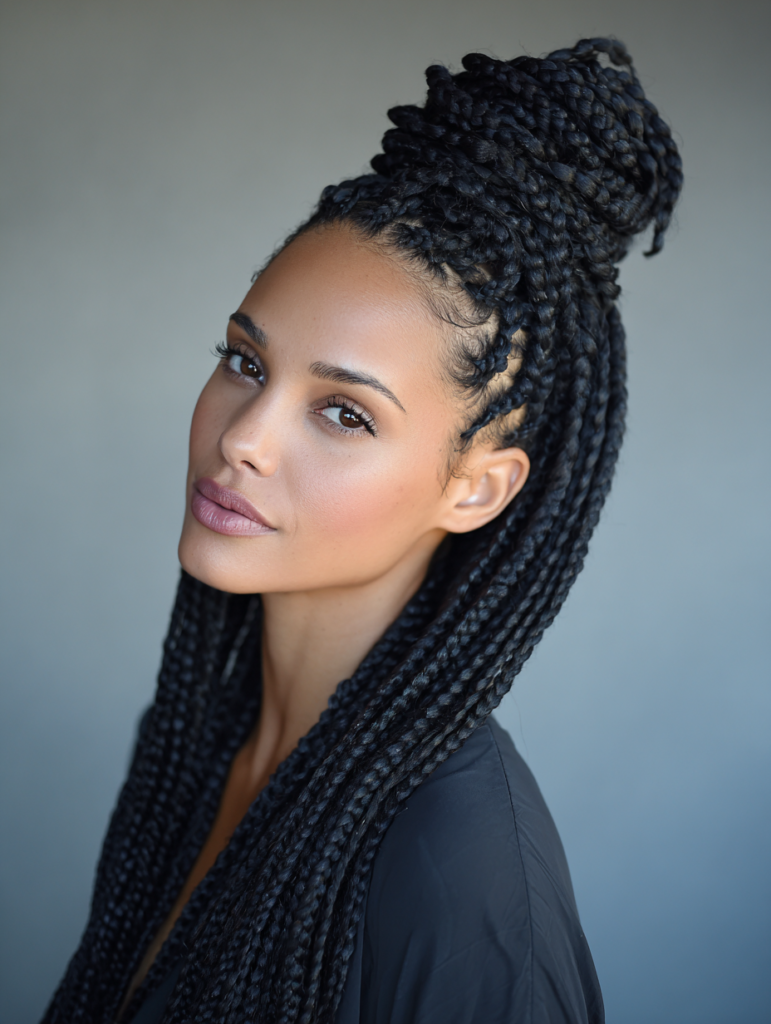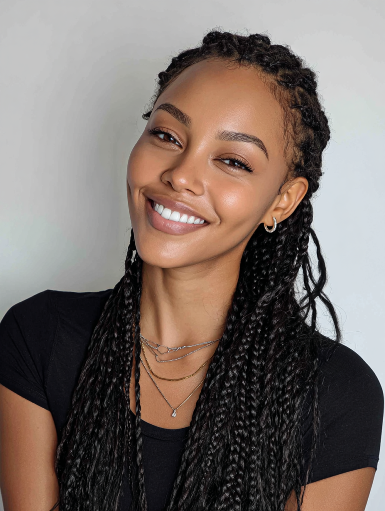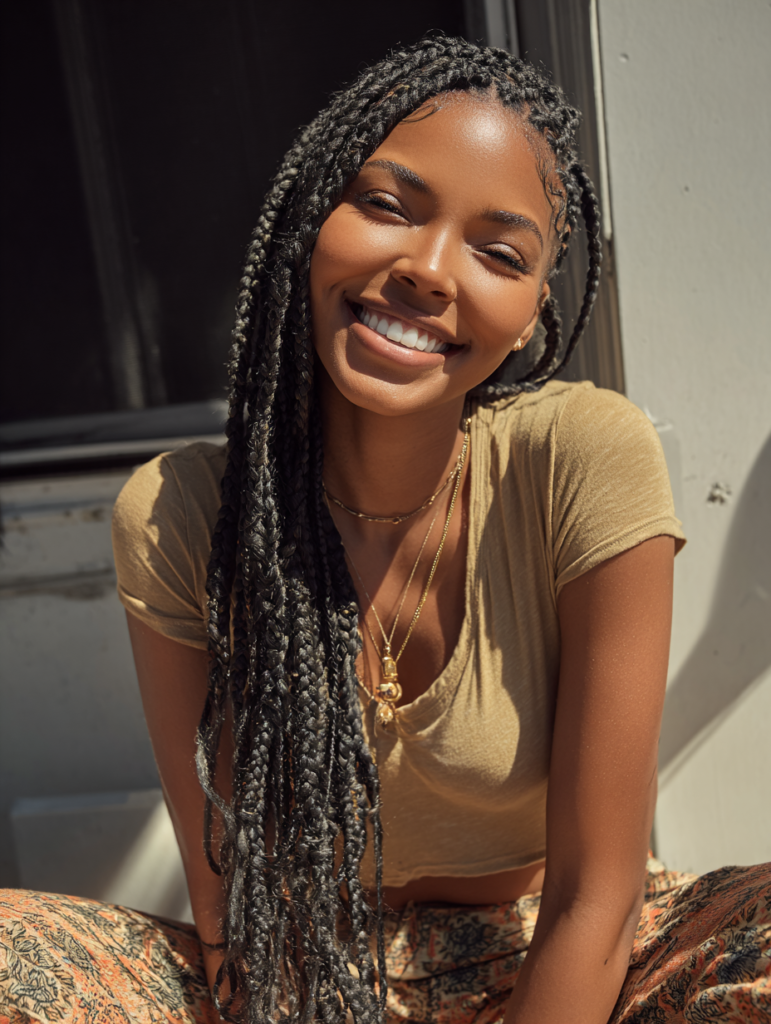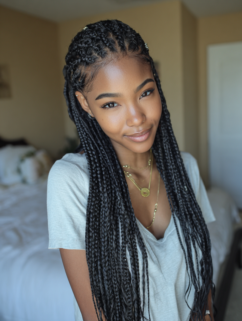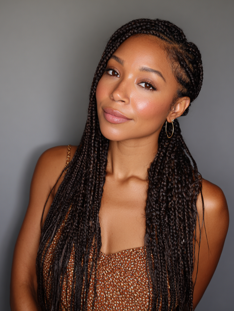 Box braids offer balanced tension and suit most face shapes with flexible parting options. They work best on medium to thick hair textures but adapt well with extensions. Box braids fit busy lifestyles because daily styling stays minimal. You can wear them down, tied back, or styled into buns.