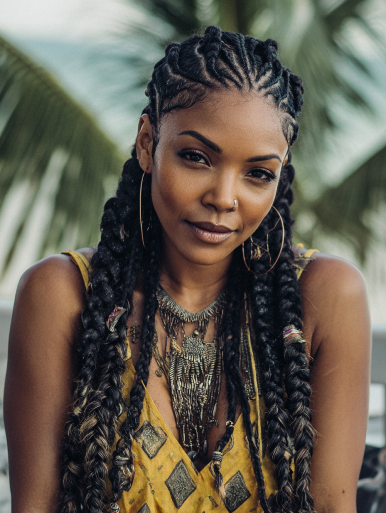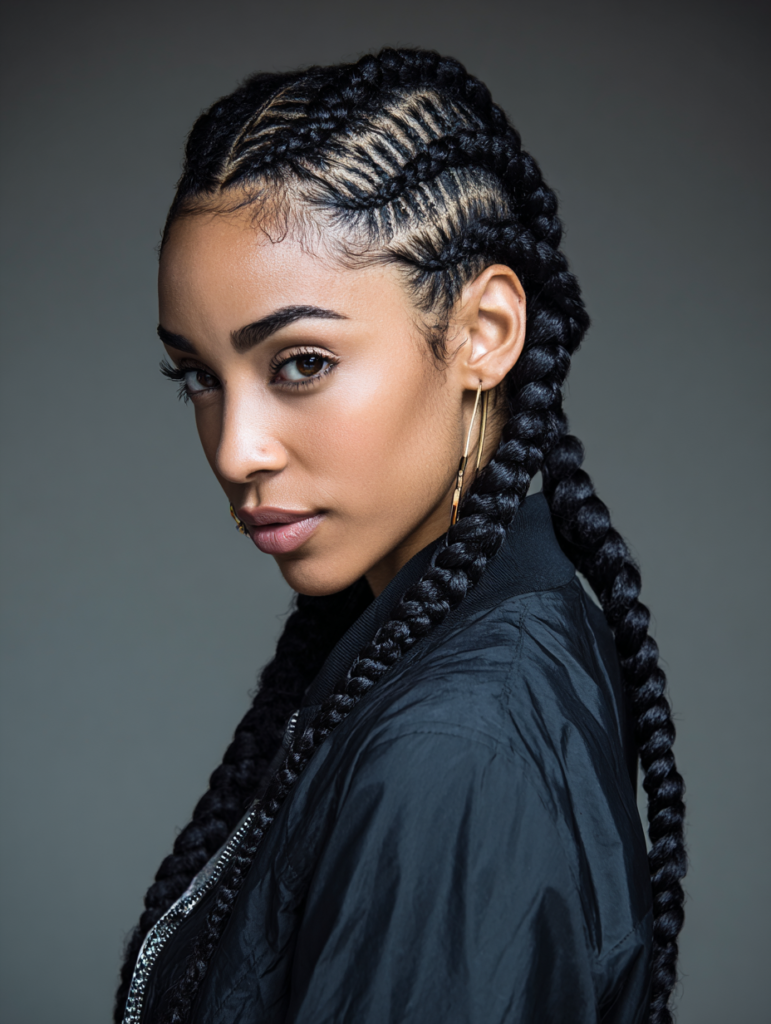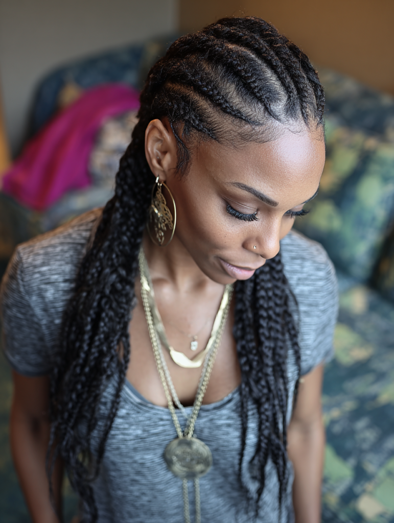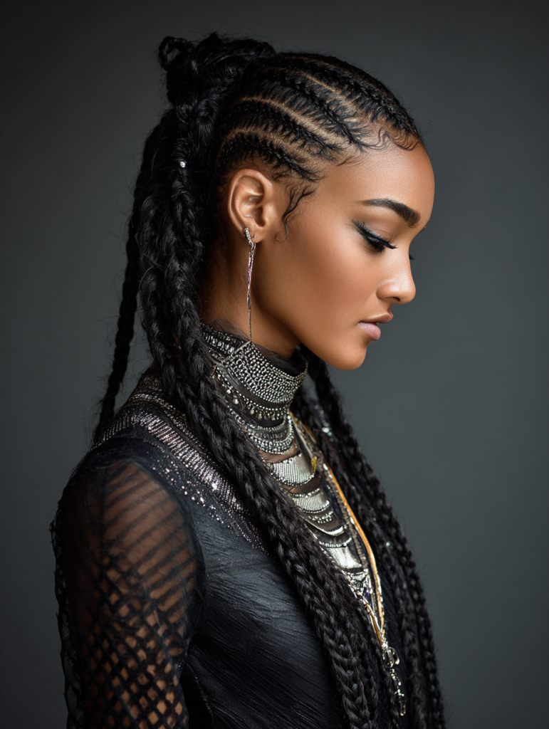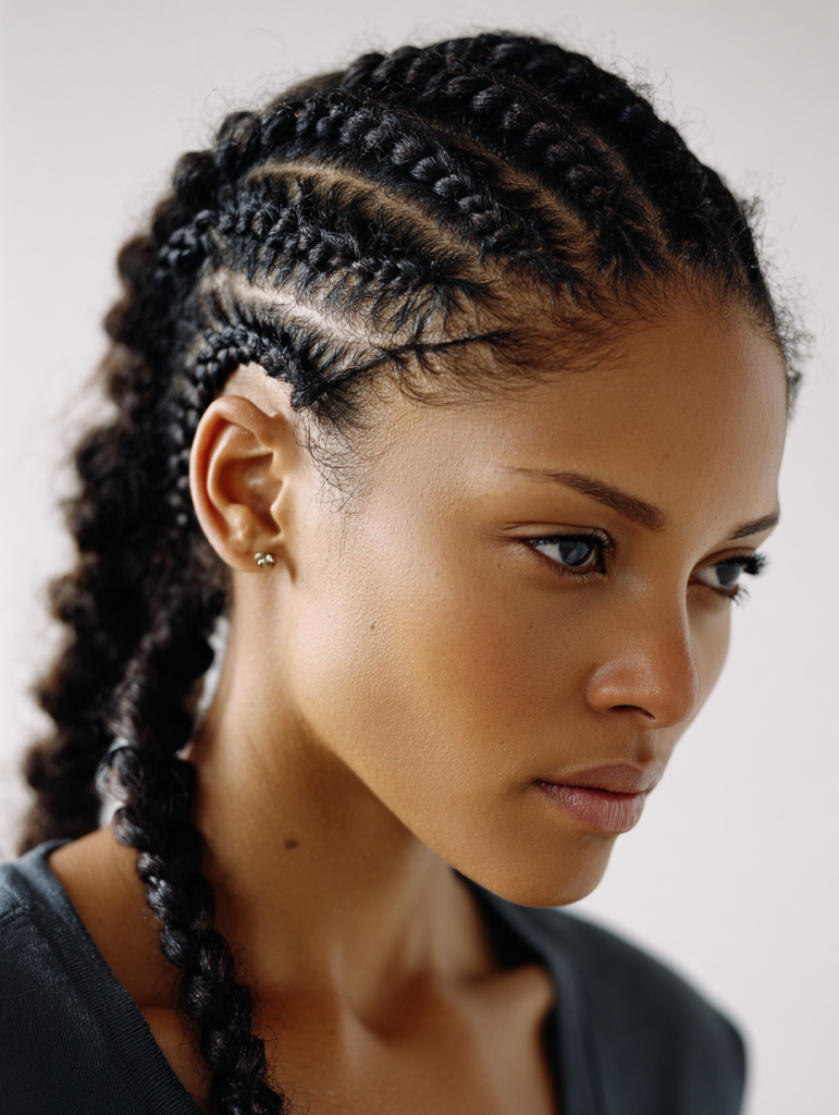 Tribal braids focus on sharp parts and directional patterns. They suit confident styling preferences and structured looks. This style works best on medium to thick textures.